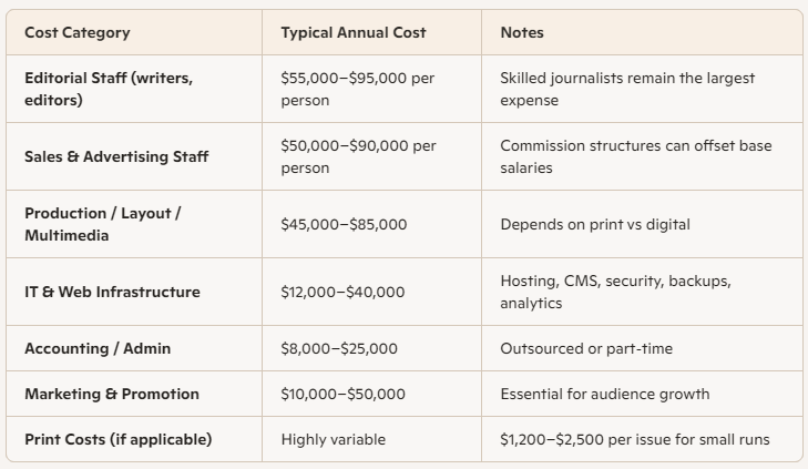 Even without print, a local news operation has unavoidable fixed and variable costs. Below is a realistic breakdown for a lean, professional small newsroom (5–10 people).