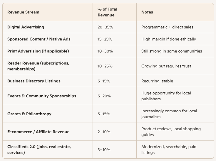 Below is a realistic revenue mix for a small local publisher: